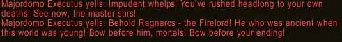 Having slain all the existing bosses in the Molten Core to get to this point, we were rewarded with the game's first view of the Firelord - Ragnaros.